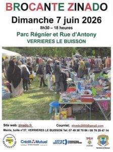 Le dossier est à nous retourner par courrier avant le 23 mai 2026 à l’adresse suivante : »Brocante Zinado 2000″ Mairie de Verrières 91370 Verrières le Buisson, ou à déposer sous enveloppe en mairie ou lors des permanences qui auront lieu au bureau du rez-de-chaussée de la Villa Sainte Christine côté mairie, les samedis 9, 16 et 23 mai de 10 h à 12 h et les mercredis 6, 20 et 27 mai de 15 h à 18h